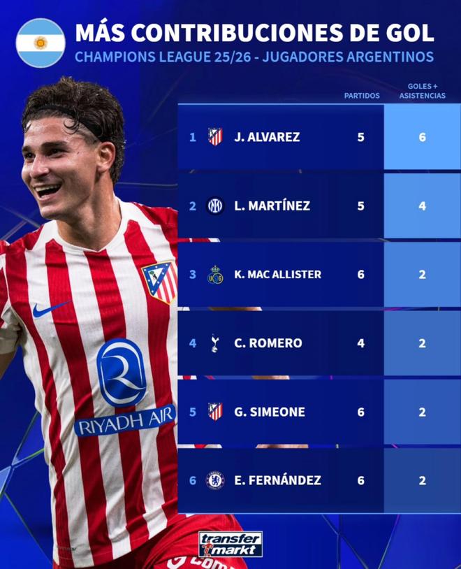 本赛季阿根廷球员欧冠参与进球榜:阿尔瓦雷斯6粒居首